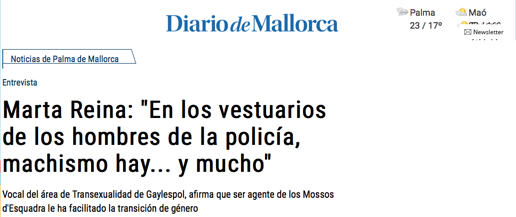 Marta Reina es perito en falsedad documental, reconocida internacionalmente y la primera agente de los Mossos de Escuadra transexual. En varias entrevistas ha denunciado al Cuerpo de ser machista, homófono, transfóbico.. hablando en primera persona: