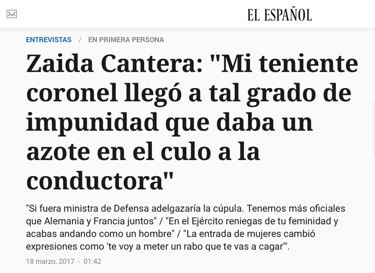 Zaida Cantera denunció en Salvados TV los casos de acoso que sufrió por parte de su superior. Cuenta que actuaba con total impunidad y era sabido en todo el cuartel. Incluso comenta que hasta 5 compañeras le confesaron que estaban sufriendo lo mismo que ella.
